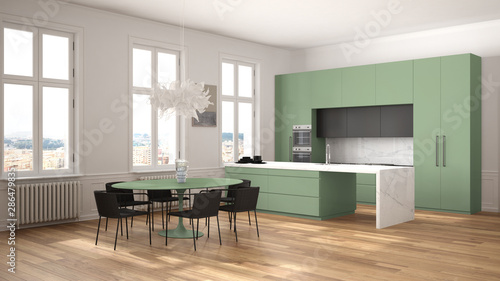 Minimalist Green And Black Kitchen In Classic Room With Moldings